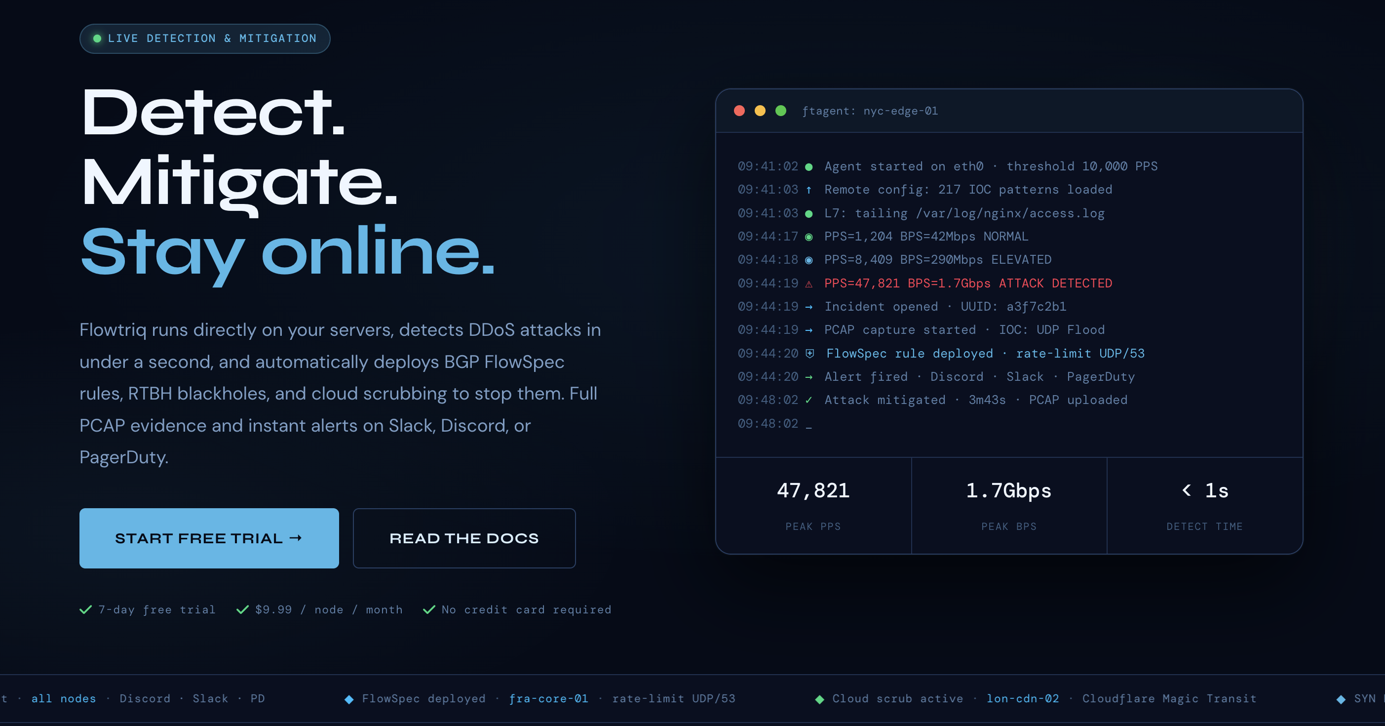 Flowtriq is an ideal solution for startups and infrastructure providers who have outgrown basic rate-limiting but aren't ready for the five-figure monthly commitments of enterprise scrubbing contracts. Its strength lies in its granularity and speed; the ability to trigger a BGP FlowSpec rule in under a second is a game-changer for game servers and fintech platforms where every millisecond of packet loss equates to lost revenue. While it requires a Linux-based environment, its lack of traffic surcharges makes it one of the most cost-predictable security assets in a founder's arsenal. For teams managing edge nodes or high-throughput SaaS, Flowtriq offers a sophisticated, data-driven shield that finally makes sub-second mitigation accessible.